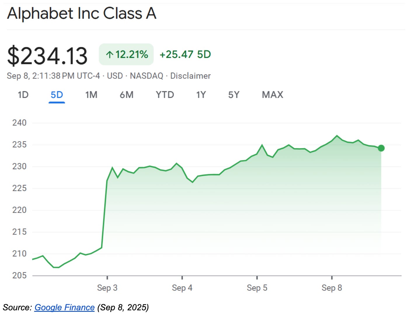 Alphabet (GOOGL) enjoyed an impressive 8% surge this week following a favorable federal court decision that preserved its lucrative search agreement with Apple, significantly easing antitrust pressure. The ruling allows Google to continue making payments to device makers to preload its services, though it cannot maintain exclusive distribution deals. This outcome was far better than the worst-case scenario that could have forced Chrome's divestiture.